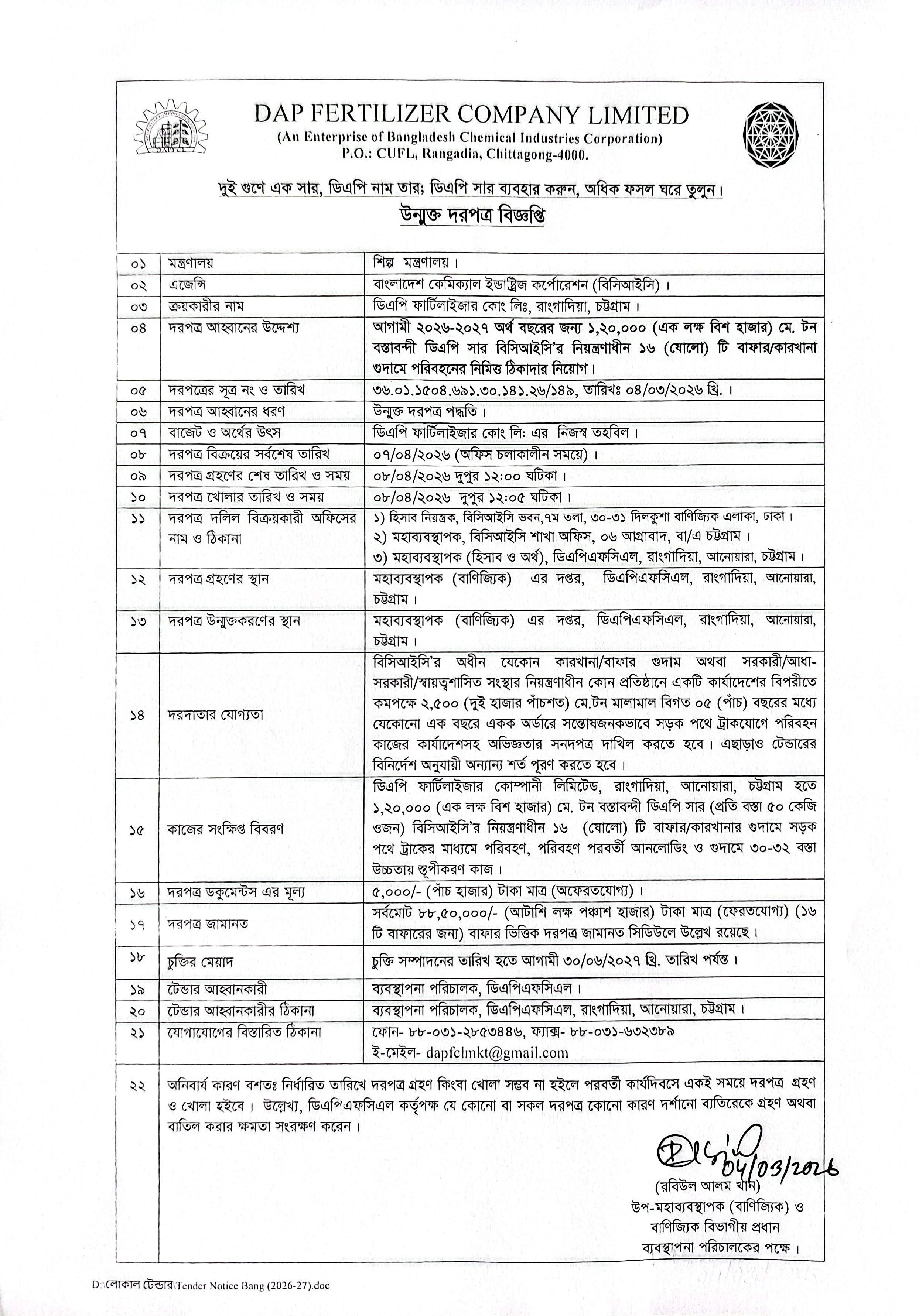 | ১ | আগামী ২০২৬-২০২৭ অর্থ বছরের জন্য ১,২০,০০০(এক লক্ষ বিশ হাজার) মে. টন বস্তাবন্দী ডিএপি সার বিসিআইসি’র নিয়ন্ত্রণাধীন ১৬(ষোলো)টি বাফার/কারখানা গুদামে পরিবহনের নিমিত্ত ঠিকাদার নিয়োগ । | স্থানীয়-দরপত্র | ০৪-০৩-২০২৬ | দেখুন | ||
